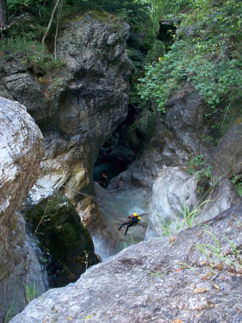 Στη συνέχεια, αφού περάσουμε το γεφυράκι θα βρεθούμε μπροστά σε δύο διαδοχικούς καταρράχτες ύψους 8μ ο καθένας. Επειδή η υδρολογία του φαραγγιού είναι η μέγιστη (5/5) η μετάβαση από τον πρώτο καταρράχτη στο δεύτερο, έγινε πρώτα καταρρηχιτικά και στη συνέχεια με τη βοήθεια τροχαλίας, το λεγόμενο και flying fox.
