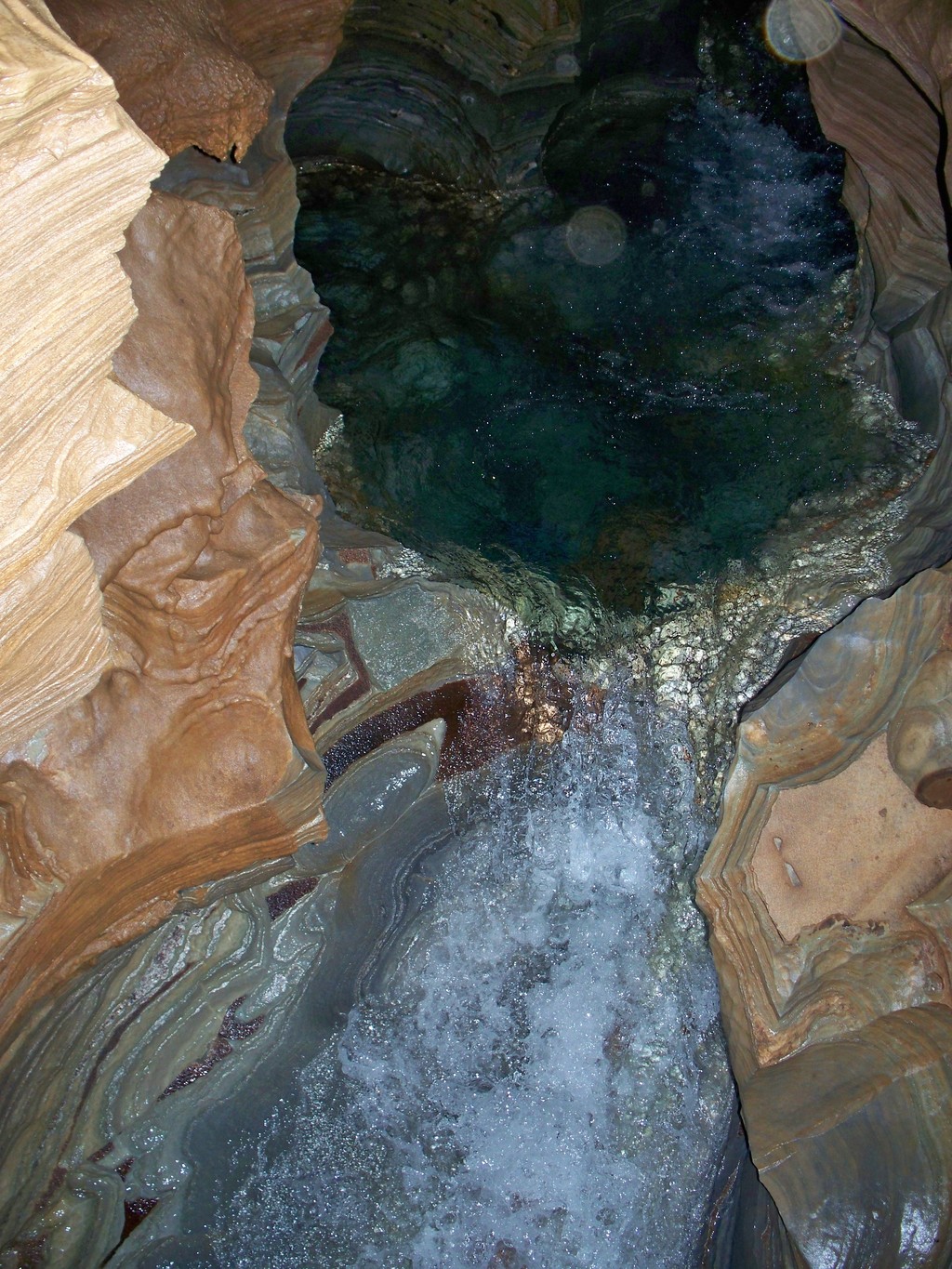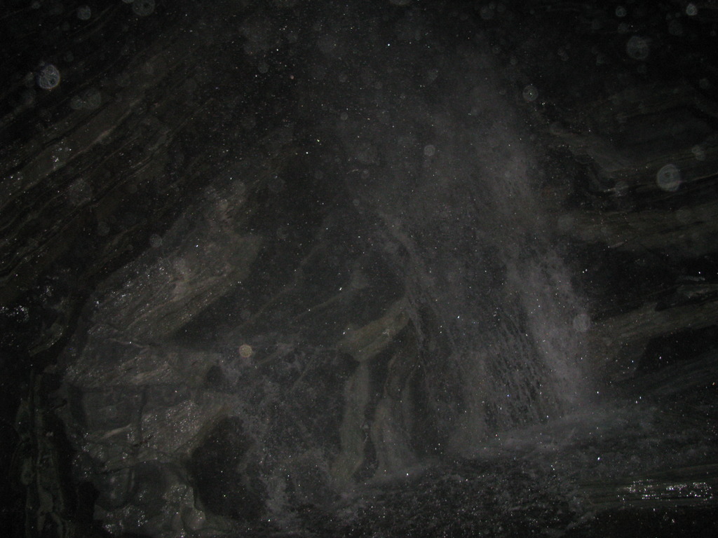 Στο τέλος του διαδρόμου ακούγεται όλο και πιο έντονα ένας εκκωφαντικός θόρυβος. Βλέπουμε στα αριστερά μας, έναν καταρράχτη ύψους 17μ περίπου! Λόγο των συνθηκών που επικρατούν σε αυτή την αίθουσα, είναι δυστυχώς πολύ δύσκολο να φωτογραφηθεί.