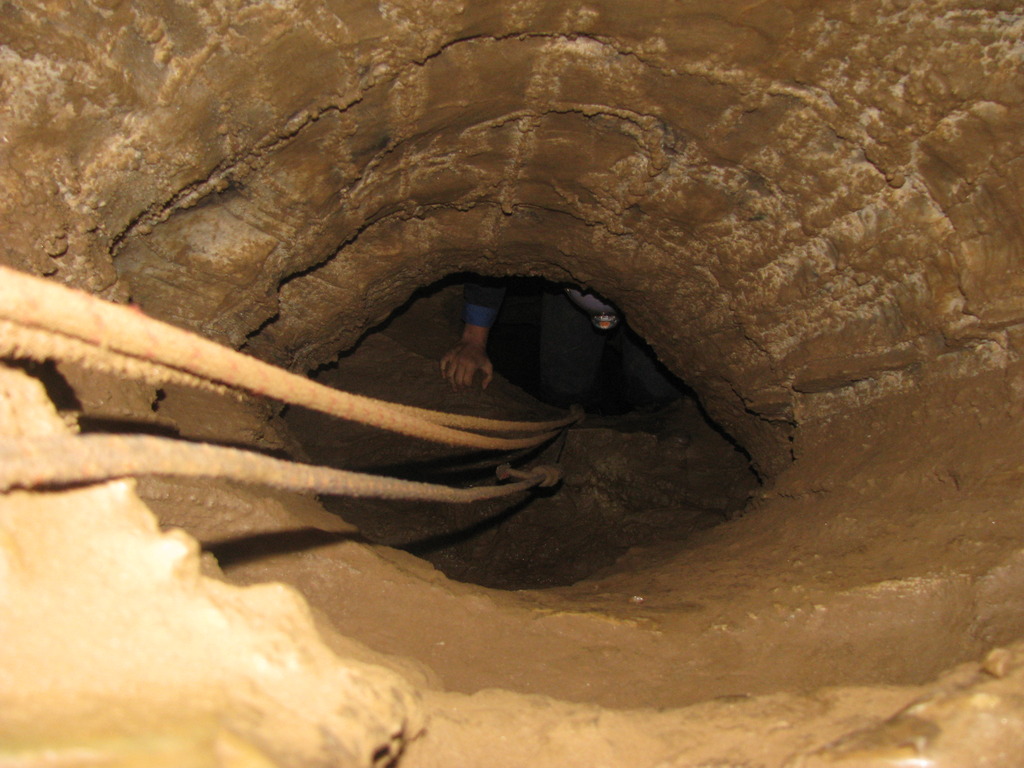 Φτάνοντας στο σιφώνι (πλημμυρισμένο με νερό πέρασμα), βλέπουμε πάνω στα αριστερά, ένα τούνελ που έχει και σχοινί.