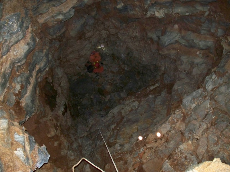 Σε αυτό το σημείο συνήθως φοράμε τον εξοπλισμό μας, καθώς εδώ χωρίζει το σπήλαιο σε δύο κατευθύνσεις όπου μετά από μερικά μέτρα σε λίγο στενά περάσματα οδηγούμαστε σε δύο βάραθρα. Το βάραθρο που βρίσκεται στην κύρια όδευση του σπηλαίου, έχει βάθος περίπου 30μ σπαστά, και στο τέλος του στενεύει μέχρι που κλείνει.