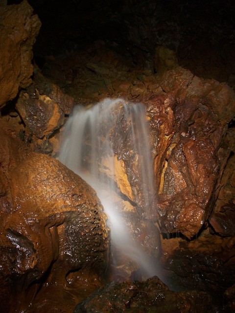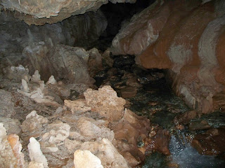 Αφού συρθήκαμε για λίγα μέτρα, ακούγοντας τον ήχο του νερού να δυναμώνει, βρεθήκαμε μπροστά στο ποτάμι. Από τα πρώτα λεπτά το σπήλαιο εντυπωσιάζει με μικρούς καταρράχτες και τις σχετικά μεγάλες αίθουσες