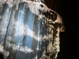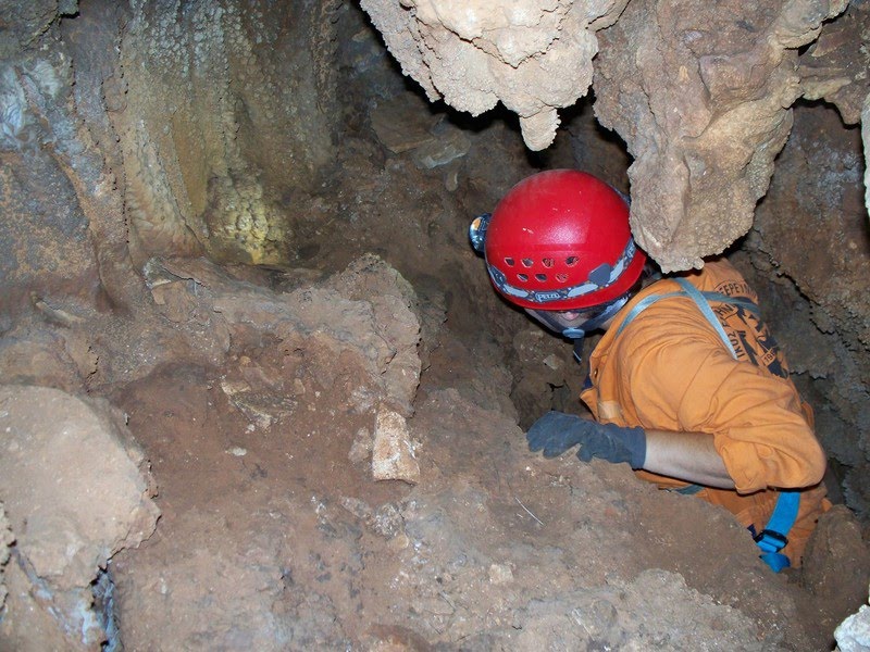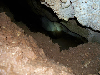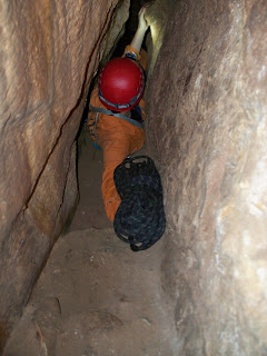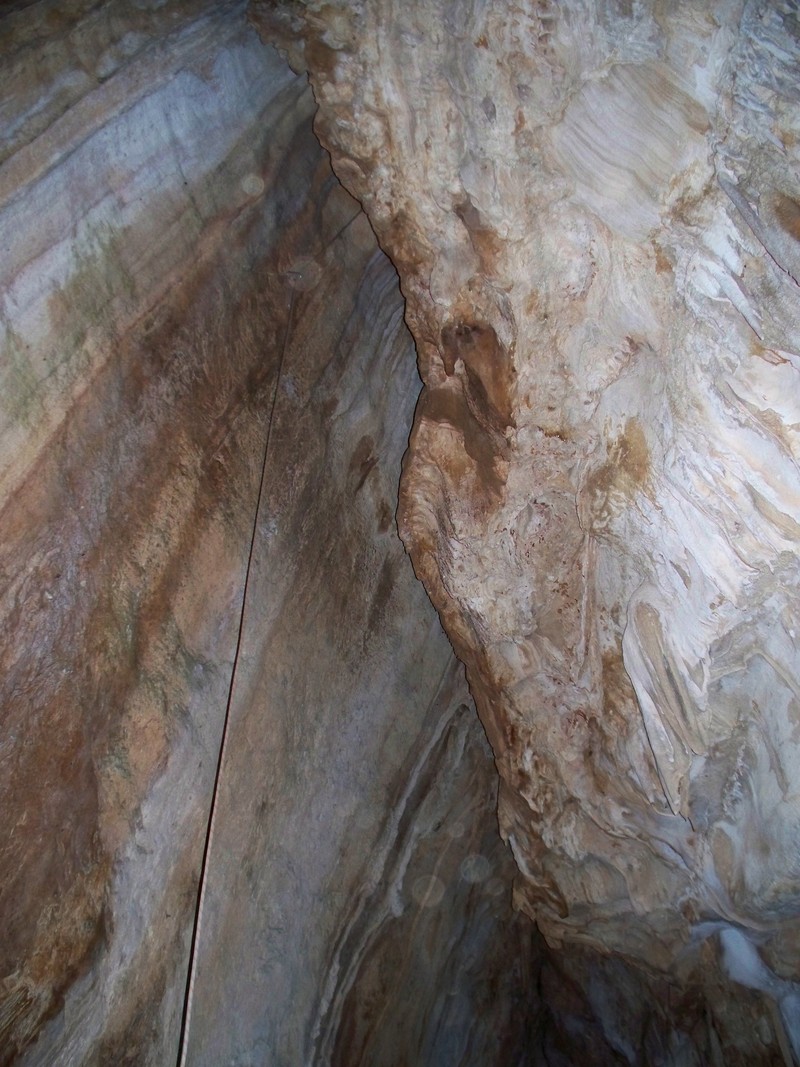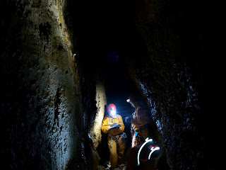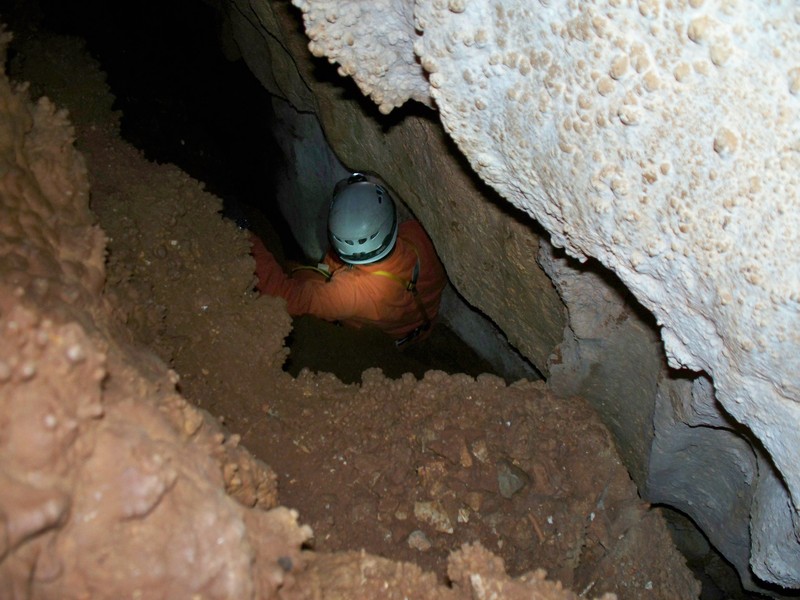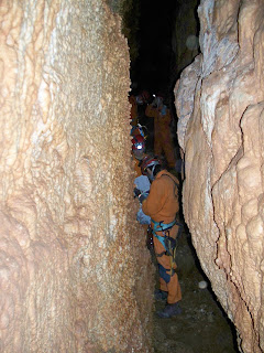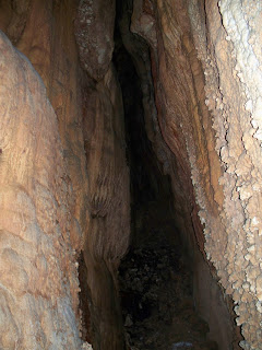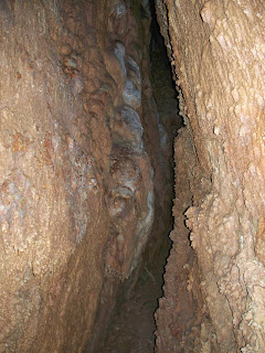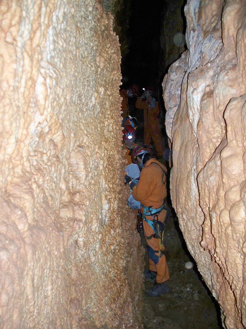 Στη συνέχεια, προχωρήσαμε προς το υπόλοιπο σπήλαιο. Αφού κατηφορίσαμε στον κύριο θάλαμο, συναντάμε ένα αρκετό στενό πέρασμα μήκος 6μ περίπου, που το πλάτος του σε ορισμένα σημεία, δε ξεπερνά τα 0.35μ.